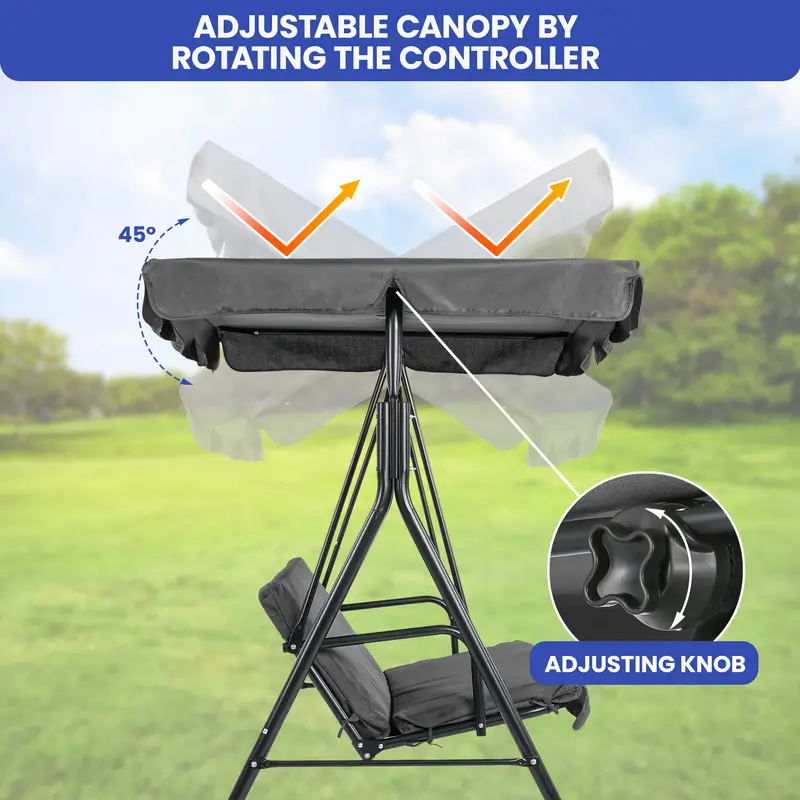 Our swing chair comes equipped with an adjustable canopy that can be rotated to any angle, offering maximum shade coverage. This feature ensures you stay cool and comfortable by preventing direct sunlight exposure, making it perfect for use at any time of day.