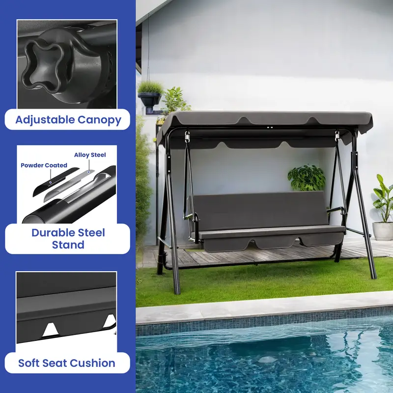 Experience ultimate relaxation with our three-seat swing chair, designed with a focus on durability and stability. Featuring powder-coated steel tubing, this swing is built to last, ensuring extended longevity and enjoyment. The heavy-duty spring hook and unique triangular construction provide maximum safety and stability, allowing you to relax with complete peace of mind.