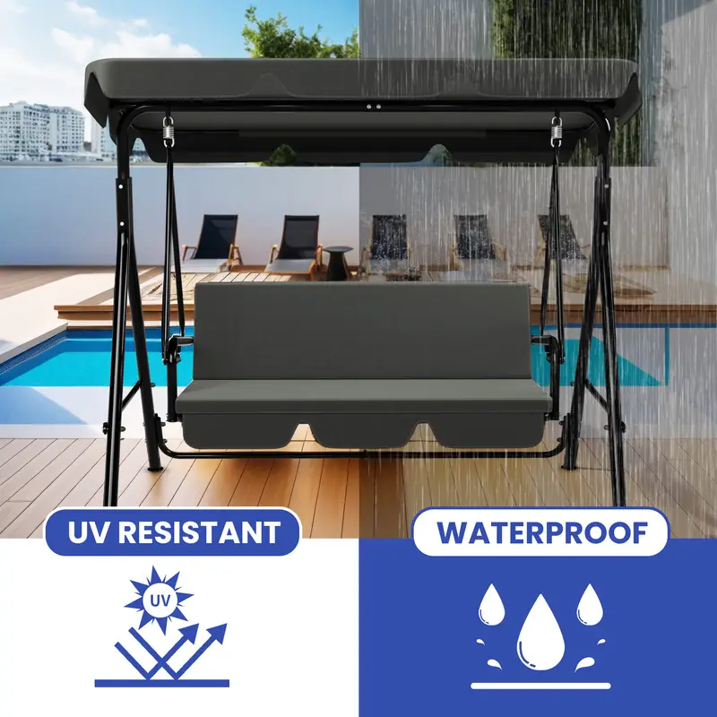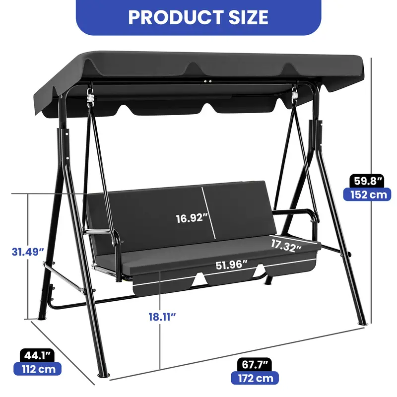Our swing bench boasts a generous 51.96" length, comfortably accommodating three people for a shared relaxation experience. The heavy-duty steel spring lock ensures it can support up to 529 lbs, providing a secure and sturdy seating option. Unwind together with friends and family on this spacious and reliable swing bench.