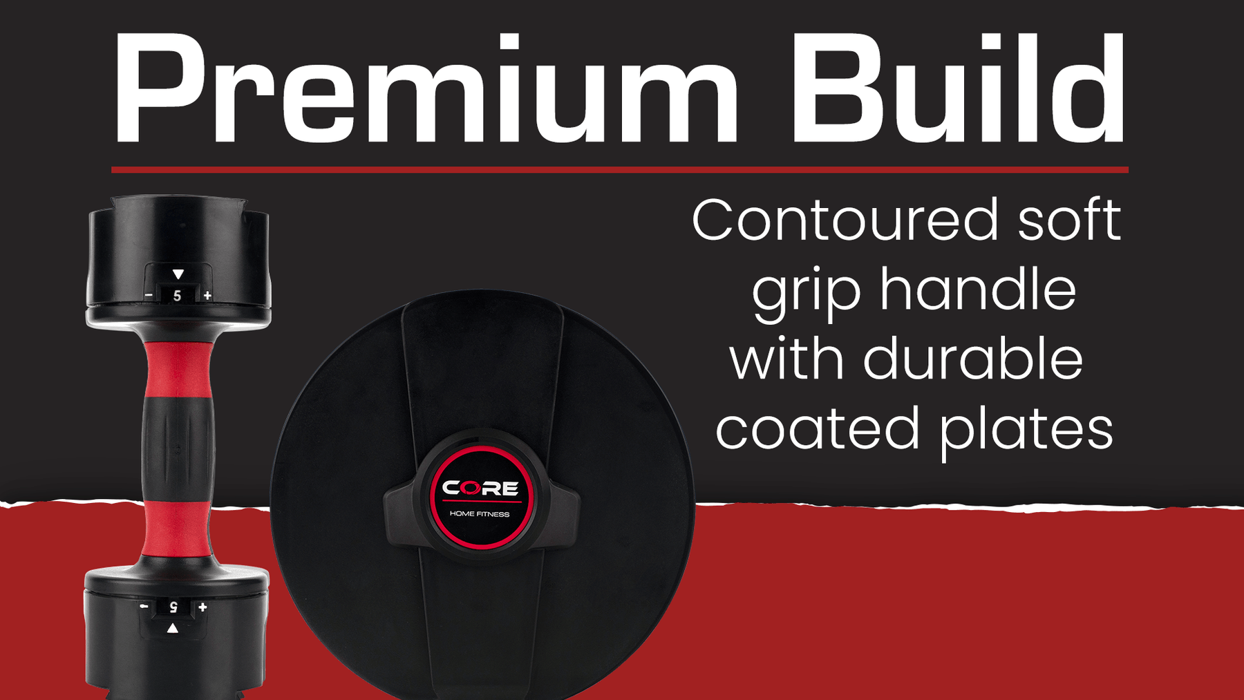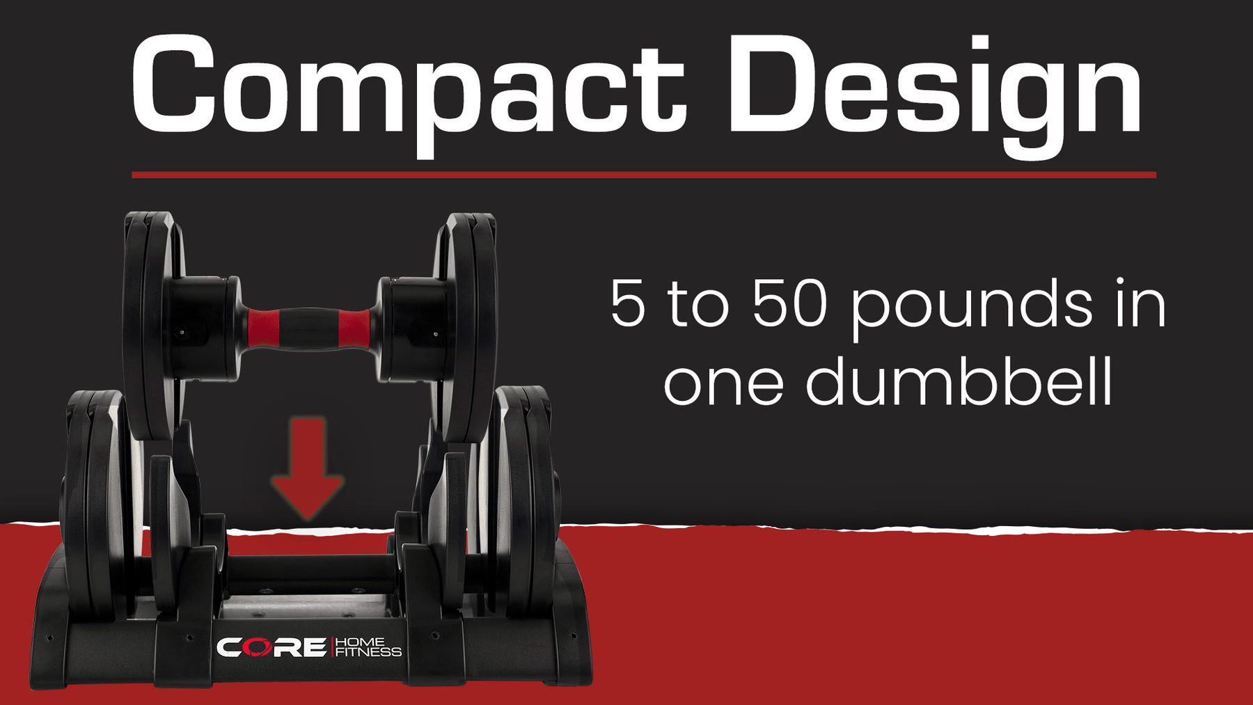 The Core Home Fitness Adjustable Dumbbells let you change weights in 5 lb. increments with the simple twist of a handle – no knobs to turn or levers to slide. With adjustable weights ranging from 5 to 50 lbs, our dumbbell gives you an entire 10-piece set in a single dumbbell – all with a durable construction and a modern, lightweight aluminum cradle. It’s a great way to get a real workout with real results – all from a smart, compact design.