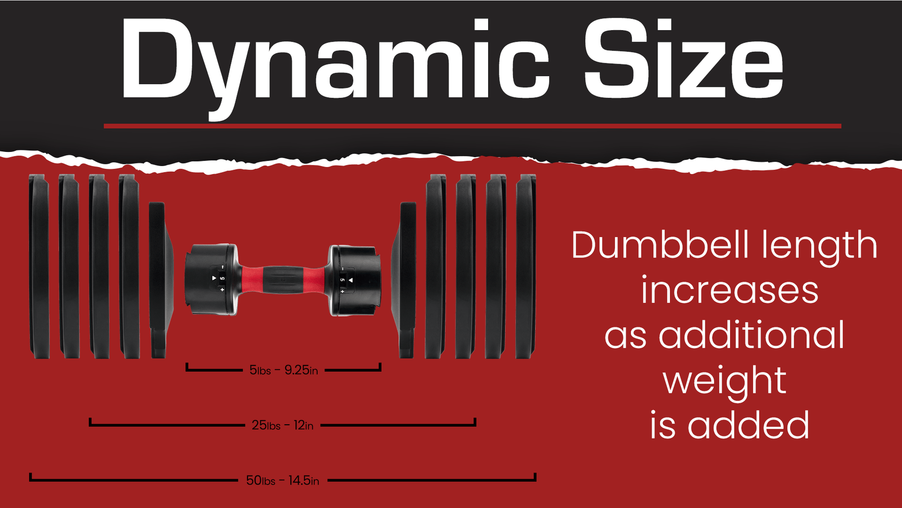 Dumbbell length increases as additional weight is added (5 lbs. starting weight is 9.3” L)